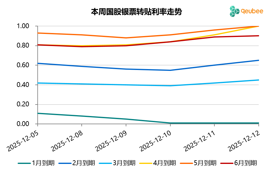 本周为12月第二周,票据利率震荡上行,明年6月到期国股银票周一小幅回落至0.79%后便再次步入上行通道,周五上午最高上行至0.95%,随后又回落至0.90%。
