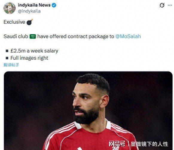 根据博主“绿帽哥”独家爆料,沙特俱乐部已向萨拉赫正式提交了一份令人瞠目的合同草案。这份合同不仅提供250万英镑的周薪,还包括2000万英镑的签约奖金以及100%的肖像权。