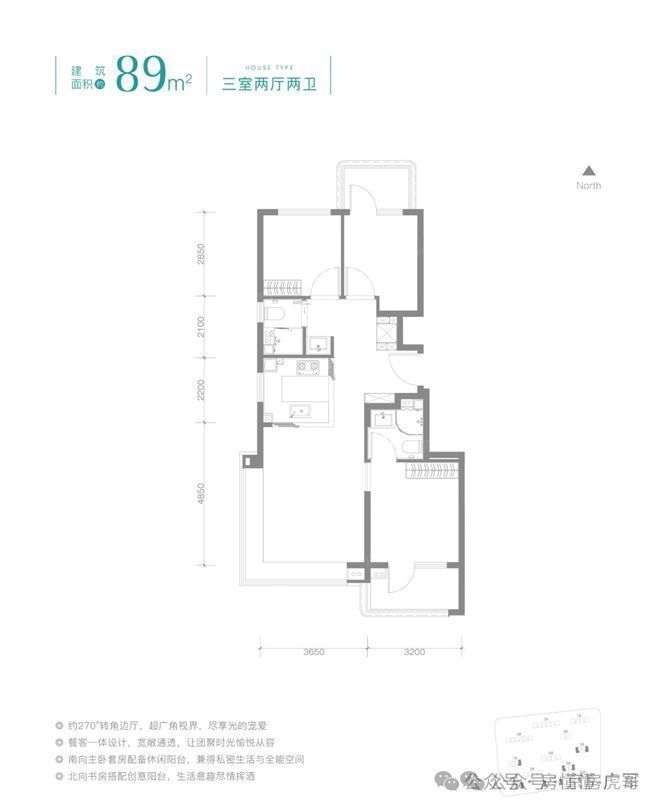 89平米三居户型,这个户型最大的亮点就是客厅270°拐角飘窗,采光和观影效果一绝。