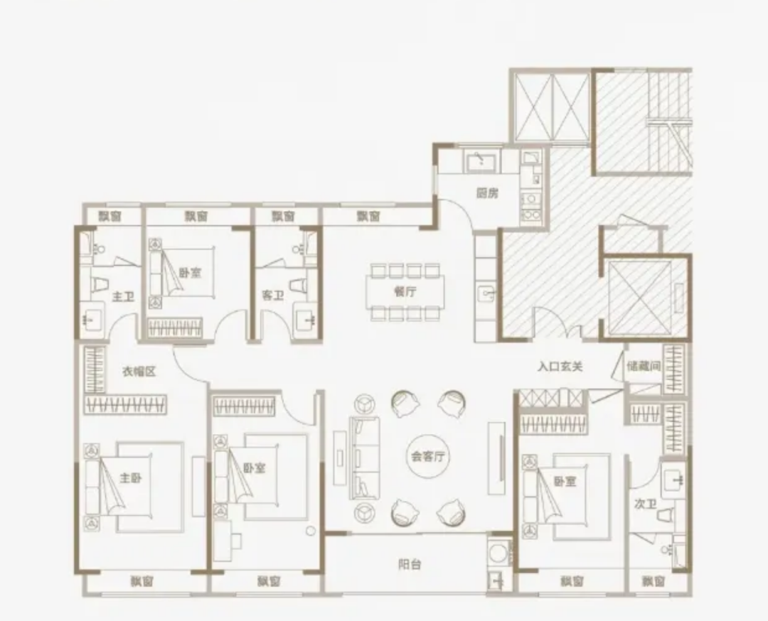 要知道,现在市面上的主流做法,是把三房的各个功能空间,都做飘窗设计,以得到更开阔的景观视野,并增加实际面积使用率。