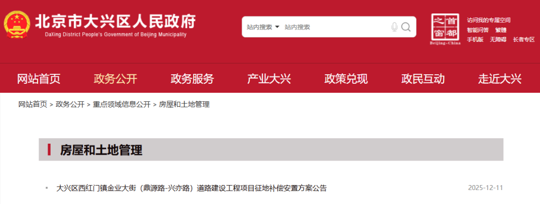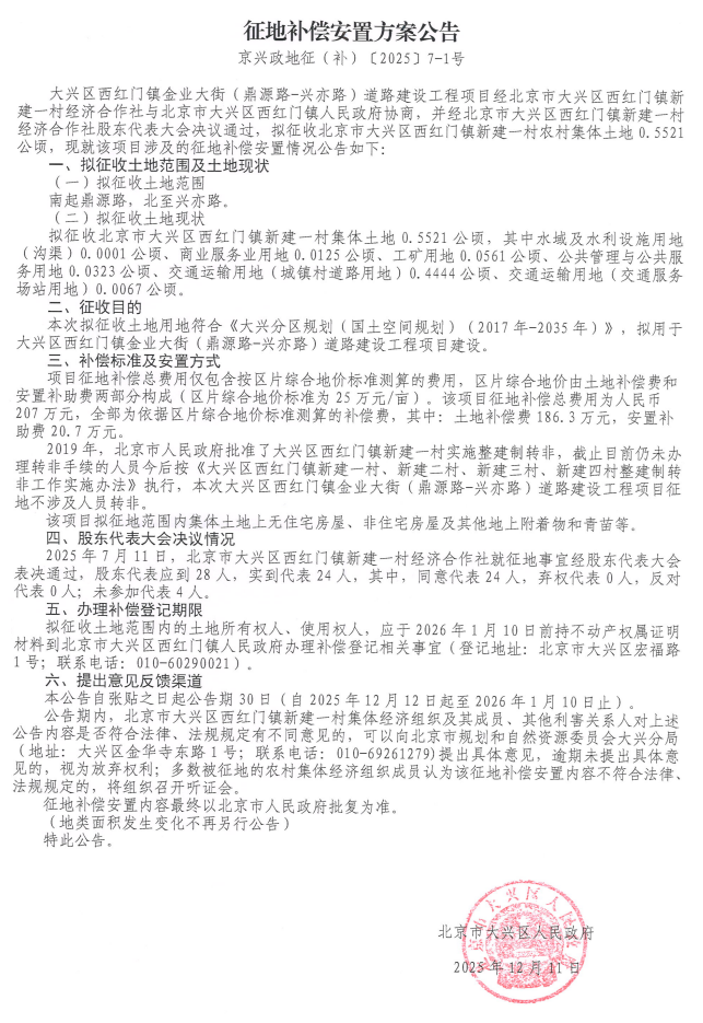大兴区西红门镇金业大街(鼎源路-兴亦路)道路建设工程项目征地补偿安置方案公告