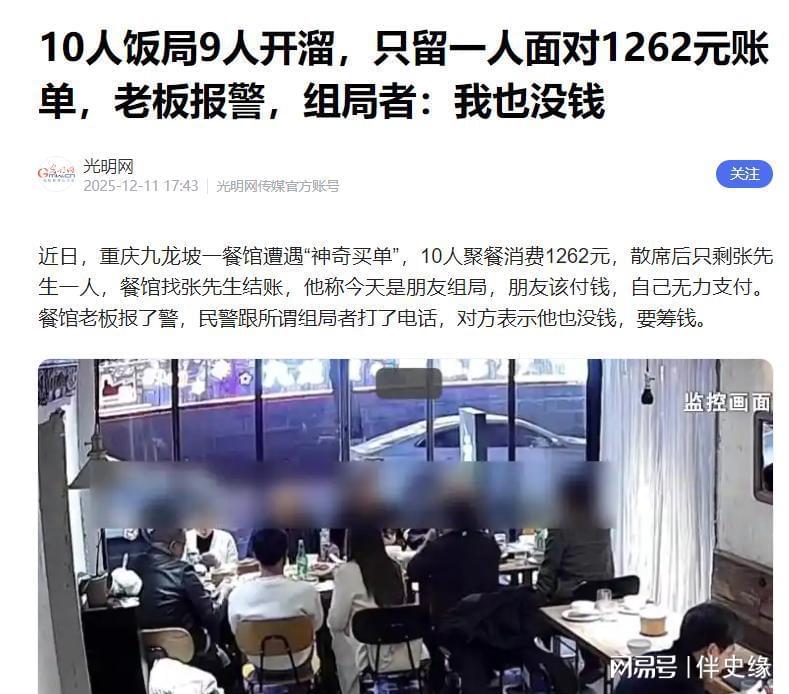 信息来源:10人饭局9人开溜,只留一人面对1262元账单,老板报警,组局者:我也没钱