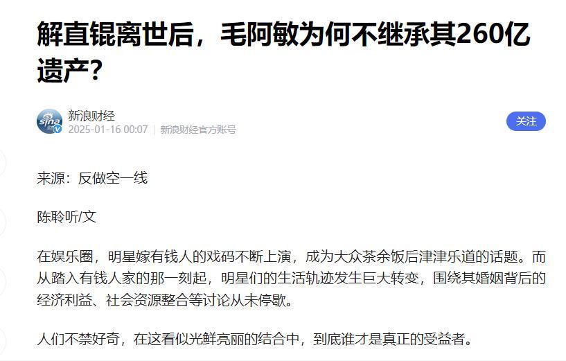 不过,歌手毛阿敏偏反其道而行——丈夫猝然离世后,她手握近200亿继承权,却果断放手,带着孩子远走美国。