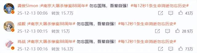 2025年12月13日国家公祭日当天,央视新闻、新华社和人民日报等主流媒体都发布了第十二个国家公祭日的有关博文,三家主流媒体关于第十二个国家公祭日的博文也是在网上引发极大关注,这其中来自文艺界的众多明星大腕也是纷纷通过不同的形式或留言、或转发,纷纷表达自己的一腔爱国情。