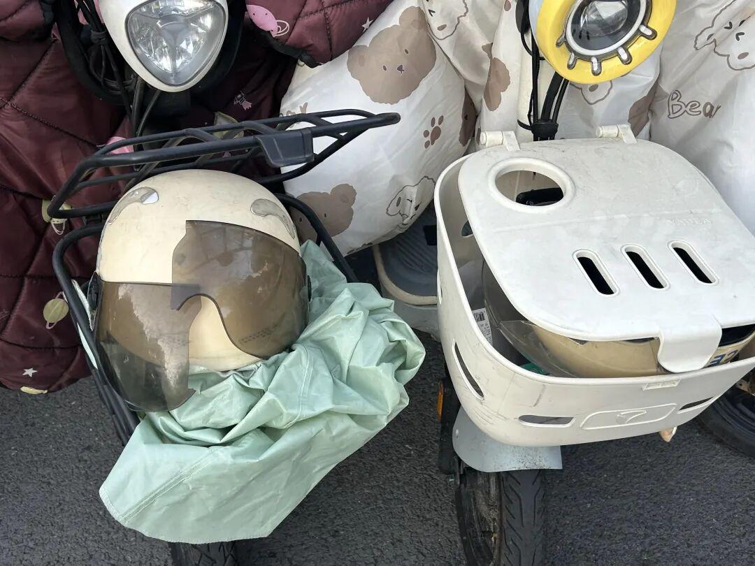 “去年买就是这个款式了,日常也够用。头盔一般就放在前面,挂外面其实也没人拿。”一位妈妈给记者介绍起来,女儿头盔摘下来就放在前篮里,车头挂钩挂的是书包,女儿下车放好头盔,再把书包一提便入校了。