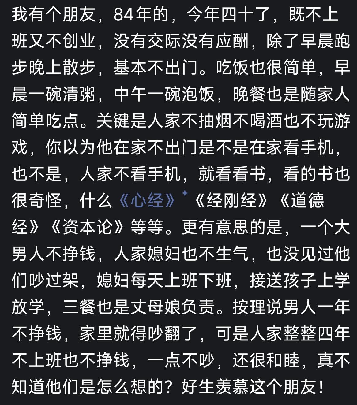 人家不上班又不意味着不挣钱,一个人不抽烟,不喝酒不玩游戏甚至不玩手机,还喜欢看有深度的书,太不简单了