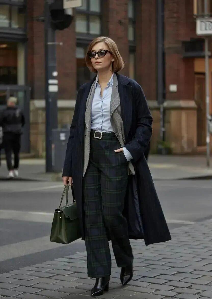 蓝色条纹长款大衣,藏着不张扬的力量,将松弛与干练揉进冬日,内搭浅蓝衬衫打底,叠穿一件灰色针织开衫,蓝灰渐变的色调温柔又高级,恰好平衡出从容不费力的时髦感,搭配蓝绿格纹阔腿裤,拔高气场,让身姿更显挺拔利落。