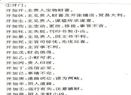 1.日干(求测者);2.日干地盘上方之天盘(对方);3.开门(新项目);4.甲子戊(资本);5.生门(利润);6.值符(银行)