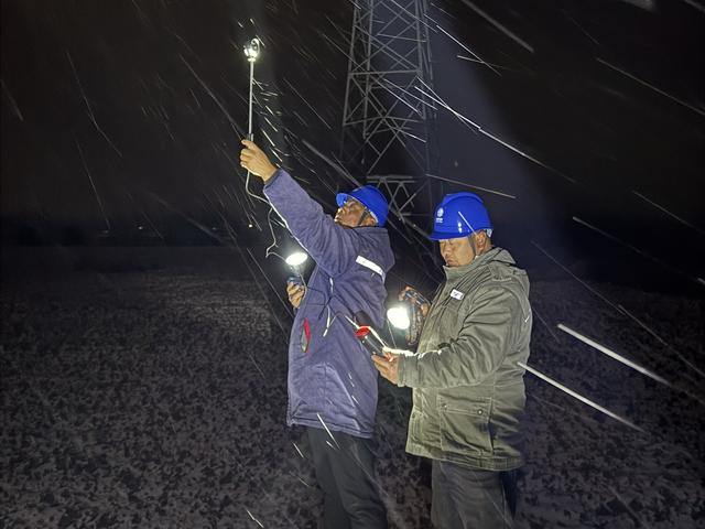 “风大,路面湿滑,大家放慢脚步、注意安全!”梁志毅的叮嘱在凛冽的寒风中清晰传递。风雪中,巡护人员身影与银线铁塔相映,勾勒出寒夜中坚守责任的动人图景。每到一基铁塔,巡护人员熟练操作风速仪、可视化监控等专业设备,逐项检测线路温度、覆冰厚度及导线舞动情况,细致完成抬头查线、俯身测温、现场研判、详实记录等工作,流程规范有序、排查不留死角。按照工作规程,巡护人员每2小时精准报送一次设备监测数据,确保电网运行状态全程可控。
