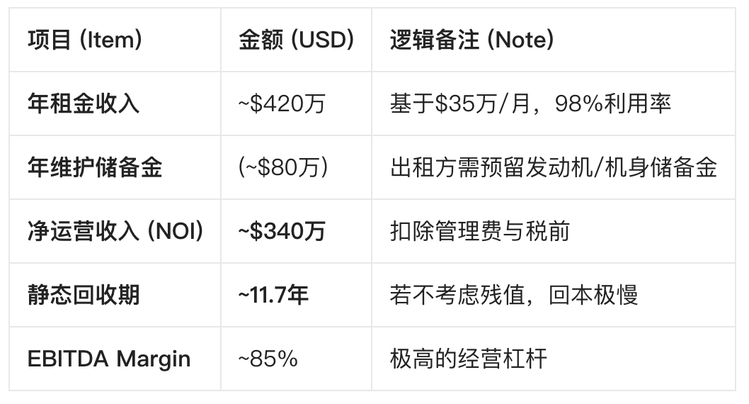 根据航空租赁界的“1%法则”(月租金应约为全成本的1%),我们需要验证这笔投资在账面上是否成立。
