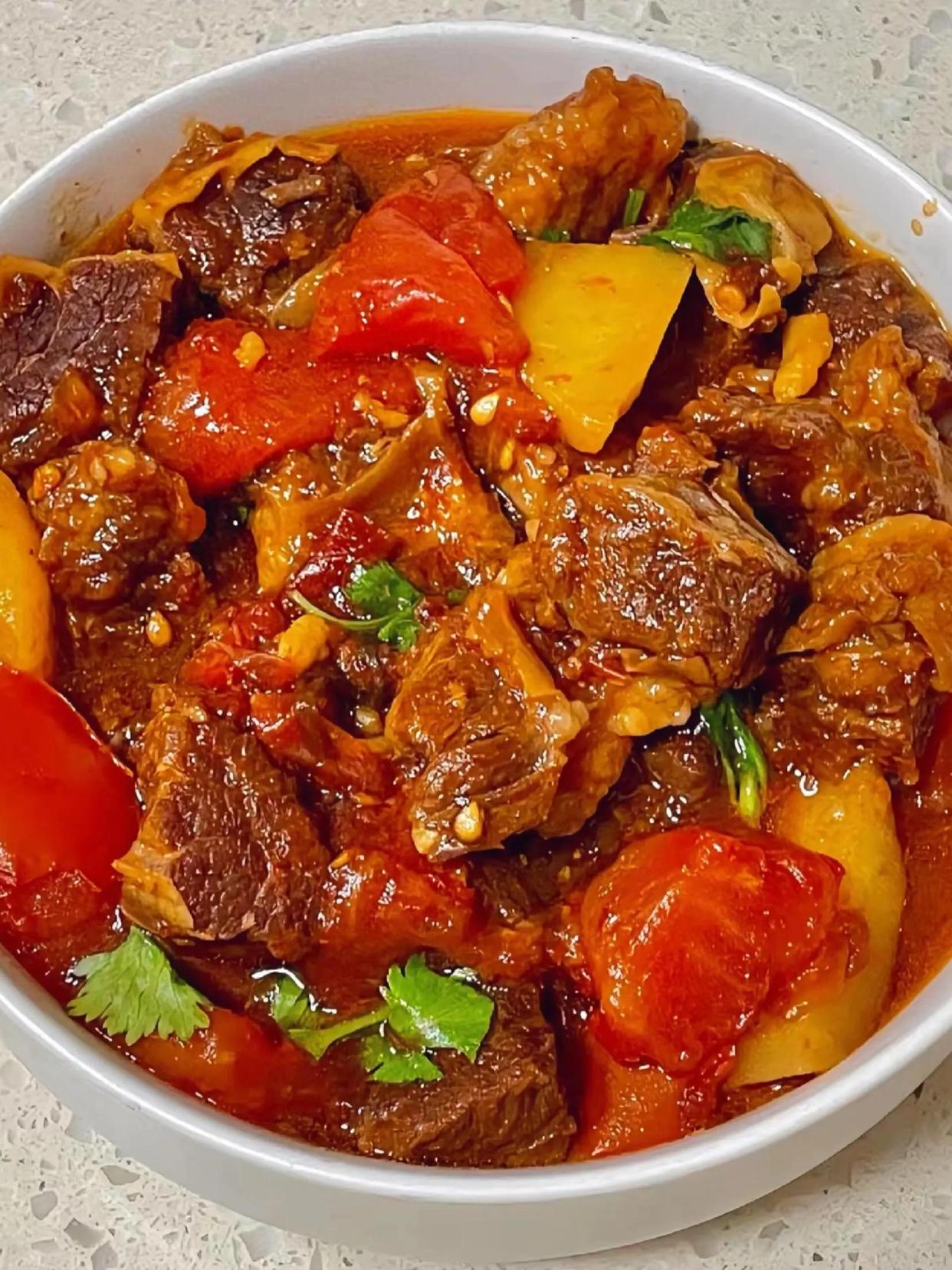 4.加水慢炖,静待软烂入味。向锅中加入足量的开水,水量要完全没过所有牛腩。记住一个黄金法则:炖肉要加开水,加冷水同样会让肉变紧。大火烧开后,转为最小的火,盖上锅盖,慢炖1.5小时。这是最需要耐心的一步,让时间魔法发挥作用。