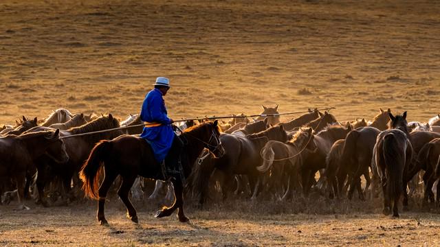 靠岸时,朝克大叔的老伴已在凉棚下摆好木桌,竹匾里的奶豆腐切得方方正正,泛着温润的乳白光。“配着沙棘酱吃,解腻。”她笑着用木勺舀起橙红色的酱,均匀浇在奶豆腐上,沙棘的酸甜与奶豆腐的醇厚瞬间交融。我咬下一口,绵软的口感在舌尖散开,格外爽口。远处的沙丘上,几匹骏马正低头啃草,棕红色的鬃毛在风里扬起,与湖面的波光相映成趣。朝克大叔指着马群说:“那是家里的‘老伙计’,以前靠它们拉水,现在日子好了,就让它们在草原上撒欢。”望着这碧湖、胡杨与牧人,忽然懂了这水库的美——不是水色的清澈,是羊皮筏的颠簸、奶豆腐的香甜,是大漠与碧水的温柔相拥。
