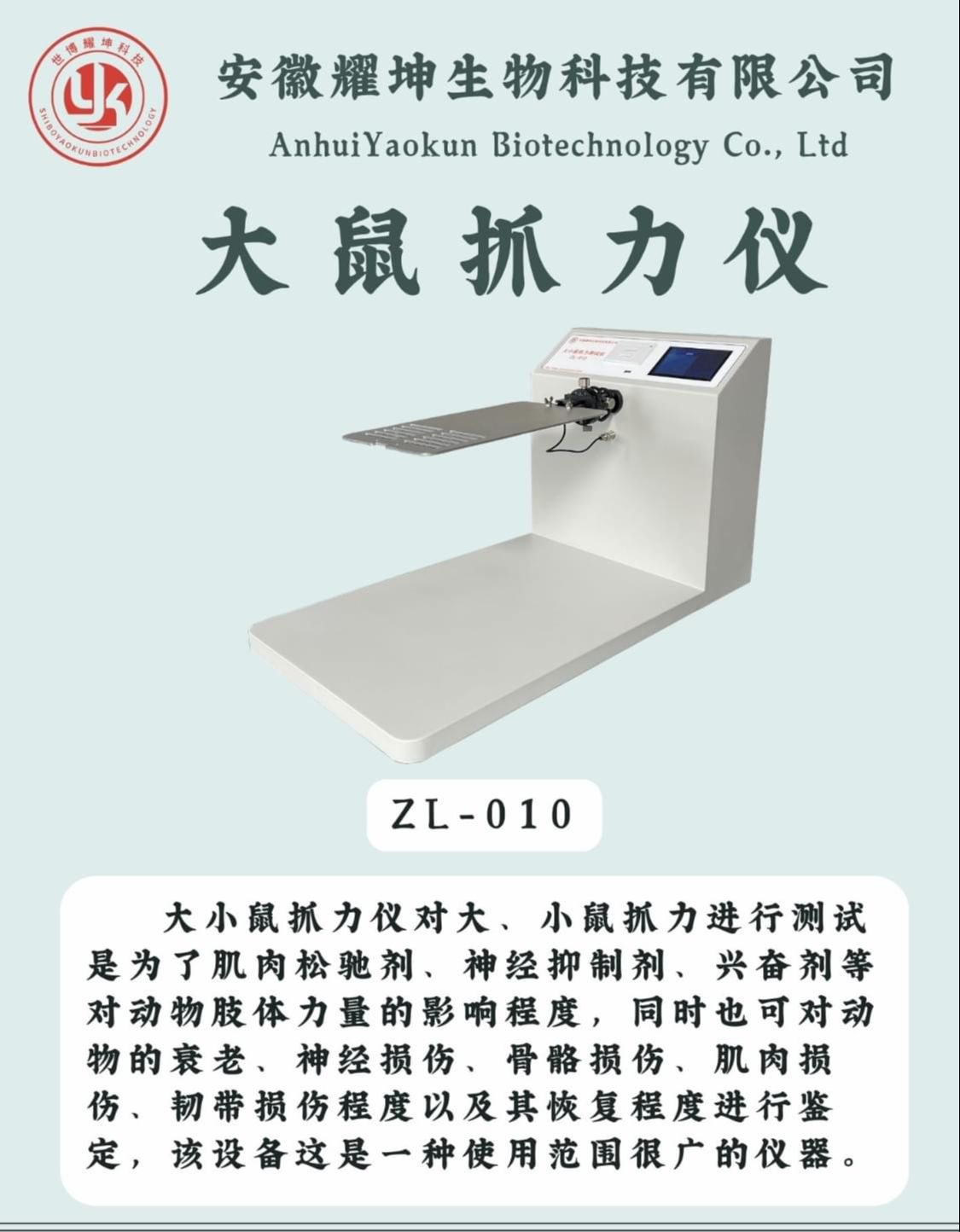大鼠抓力仪对大鼠抓力进行测试是为了肌肉松驰剂、神经抑制剂、兴奋剂等对动物肢体力量的影响程度,同时也可对动物的衰老、神经损伤、骨骼损伤、肌肉损伤、韧带损伤程度以及其恢复程度进行鉴定,该设备这是一种使用范围很广的仪器。