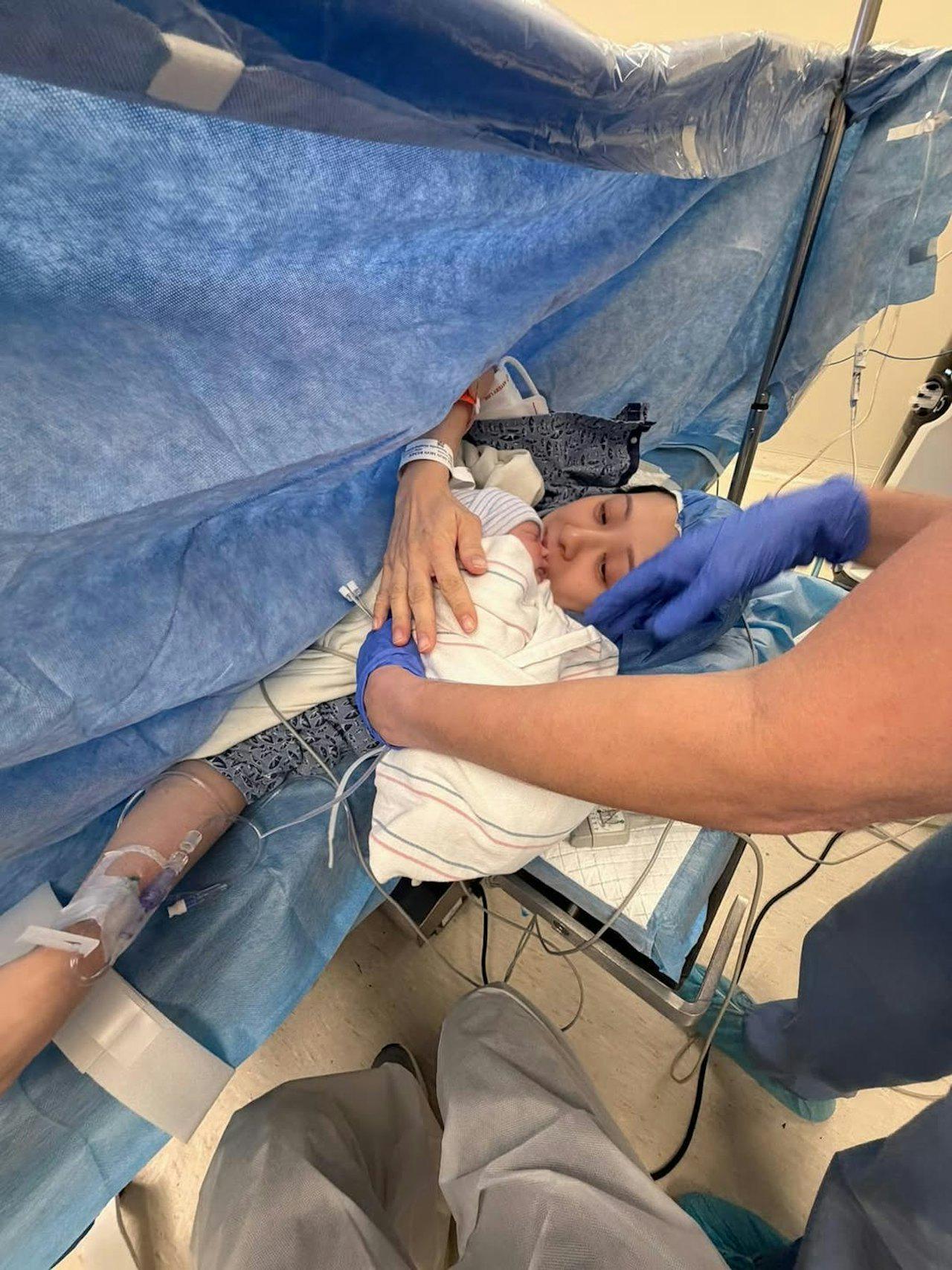 戴梦梦在社交平台上分享了女儿出生后,她怀抱女儿的照片。从照片来看,戴梦梦睡在病床上,一只手还插着针管,医生护士抱着才出生的女儿到她的跟前,戴梦梦一只手抚摸着孩子,双眼泛着泪光,可见她见到了女儿后非常激动,所以才流下了感动的眼泪,不舍得让女儿离开自己。陪伴戴梦梦生育的是她的丈夫,丈夫也非常喜欢孩子,女儿出生后,他还将一只手指放在孩子的手上,让女儿握着他的手,呈现出满满的父爱。而才出生的孩子,非常可爱,肉眼可见地让人觉得长得很像戴梦梦。
