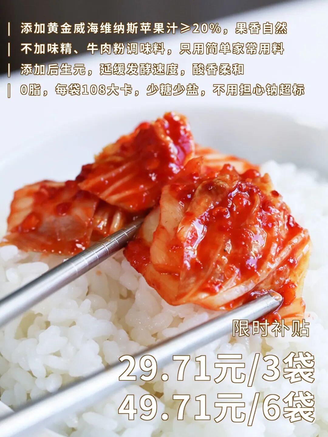 盐渍、抹酱全用少盐处理,连鱼露、虾酱都是定制减盐版,钠含量远低于其他品牌(普通辣白菜钠约1000mg/100g,这款更低),单靠苹果甜和发酵鲜补足风味,咸淡刚好不齁。