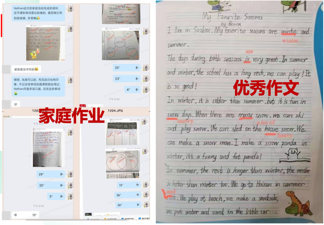 老师会根据孩子的学习情况留作业,还会 给出针对性的评价与反馈,包括批改作业、分析考卷、指导发音等。