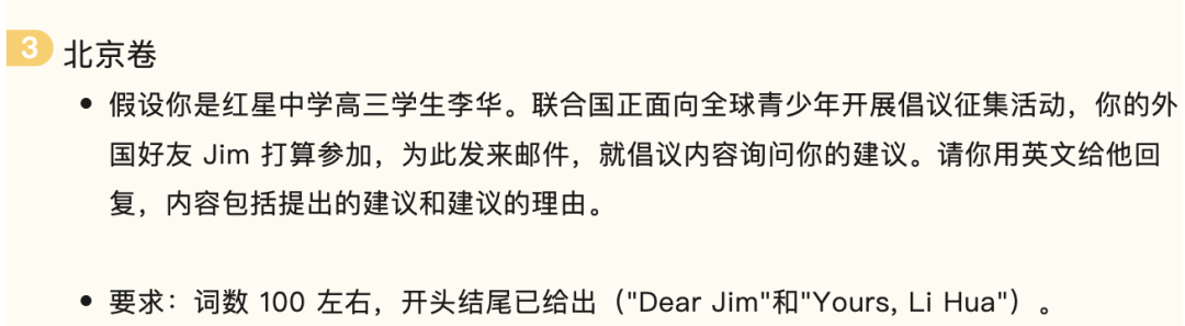 比如去年高K北京卷,就是聚焦联合国全球青少年倡议征集活动,让孩子站在外国好友的角度给建议。