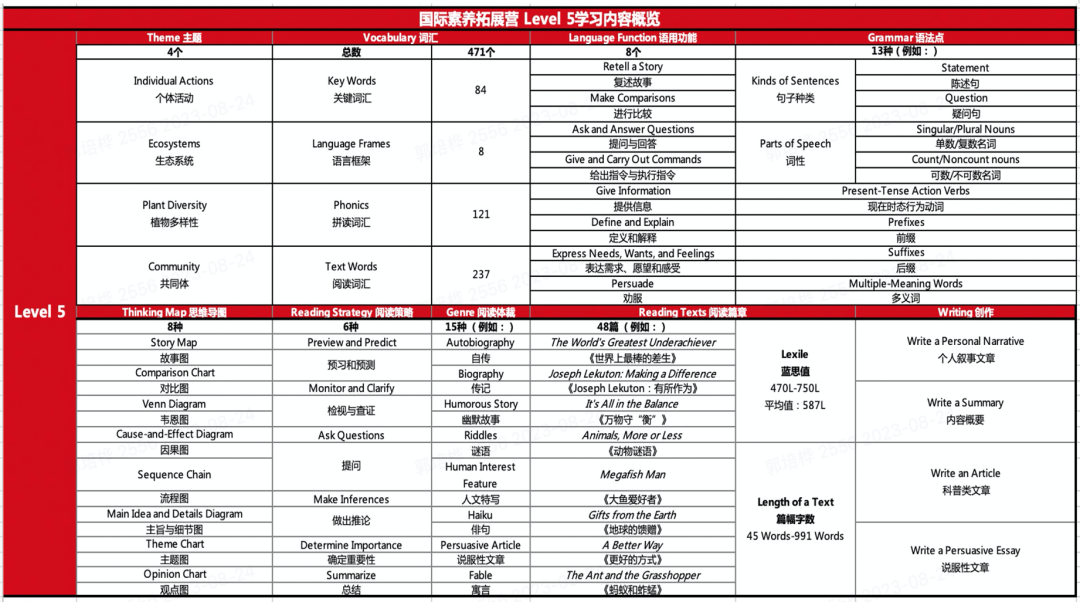 每个级别学习4种文体形式的创作,例如图片报道、说明书、感谢信、故事、科普类文章、气象报告、文学赏析等。