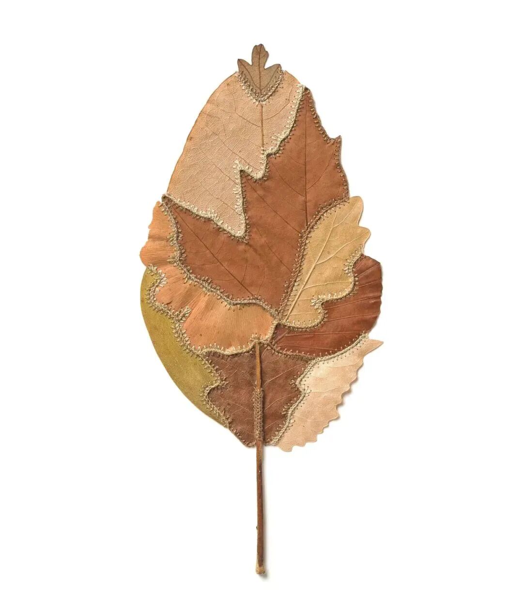 仔细看上面的叶子,确实只是一片枯叶,但是她把中间一部分圆形切割了下来,然后调整了一下角度,又重新缝合好了。看看下面的大图就明白了~