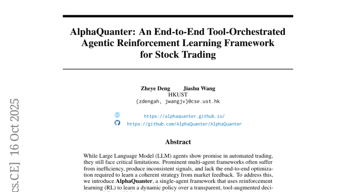由香港科技大学邓哲晔和王嘉舒两位研究者开发的AlphaQuanter系统,就像给人工智能装上了一个专业交易员的大脑。这项发表于2025年1月的研究成果,首次让AI能够像人类交易员一样,主动收集信息、深度分析,并做出交易决策。有兴趣深入了解的读者可以通过论文编号arXiv:2510.14264v1查询完整论文。