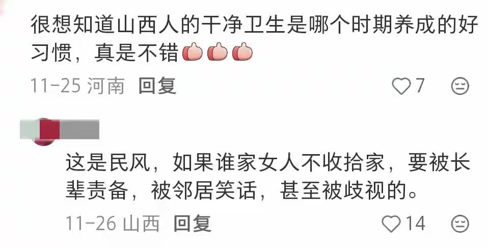 有河南网友好奇“山西人的干净是哪个时期养成的”,山西网友直接回:“这是民风!谁家女人不收拾家,长辈骂、邻居笑,连人都被歧视。”根本不是“某个时期”,是祖祖辈辈传下来的生活规矩。