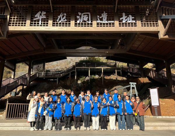 午后13时30分,研学团队奔赴东至华龙洞遗址,探寻远古人类的生活印记。在占地面积约1200平方米的遗址陈列馆内,学生们通过复原的石灰岩地貌、考古挖掘现场,穿越回30万年前的华龙洞。借助与“东至人”的互动装置、形态各异的化石展品,大家深入了解到,华龙洞作为安徽首个同时出土古人类化石与旧石器的遗址,为研究中国直立人分布、东亚现代人起源提供了核心实证,素有安徽“周口店”之称。随后,学生们前往900米外的遗址现场,在恢弘的遗址大棚内,透过玻璃栈道与高空栈道,观察不同年代的地层垂直分布、巨石与胶结物的原始状态,更在细微处寻找地层中留存的化石痕迹,直观感受考古工作的严谨与远古文明的神秘。
