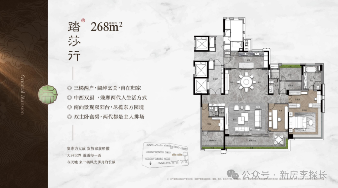 · 268㎡四房三卫:楼栋端户专属户型,3梯2户配置,保姆电梯与保姆房独立分区。主卧步入式衣帽间、双台盆设计及270°全景飘窗,彰显尊贵身份。