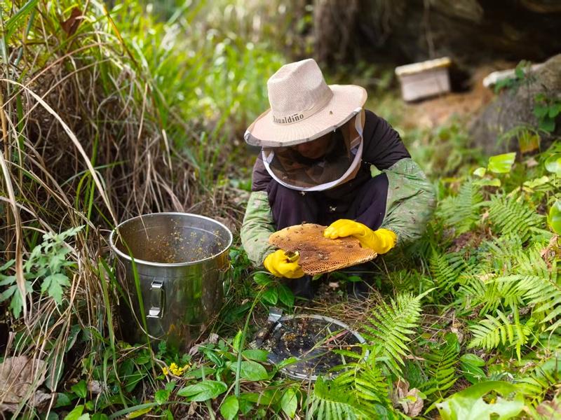 冬日暖阳,穿透苍翠林海,柔和地洒在松桃苗族自治县普觉镇尖山村的一处岩洞内外。洞内,蜂箱错落,嗡嗡声不绝于耳;洞口,蜂农头戴遮蜂帽,手持割蜜刀,轻轻割下金黄饱满的蜜巢。晶莹剔透的蜂蜜缓缓滴落,空气中弥漫着沁人心脾的甜香。12月14日,在这片静谧而繁忙的山林里,一幅人与自然和谐共生、产业振兴带动群众致富的生动画卷,正徐徐展开。