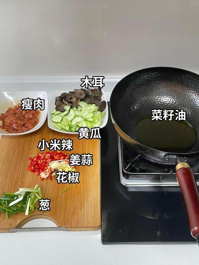 泡发好的黑木耳一小碗,黄瓜一根切片,猪里脊肉150克切片。此外还需要胡萝卜半根切片配色,葱姜蒜末少许。肉片腌制同“黄瓜肉片”(料酒、生抽、淀粉、油)。最后还需要调一个碗汁:生抽一汤匙、蚝油半汤匙、盐和糖少许、淀粉一小勺、清水三汤匙,搅拌均匀。