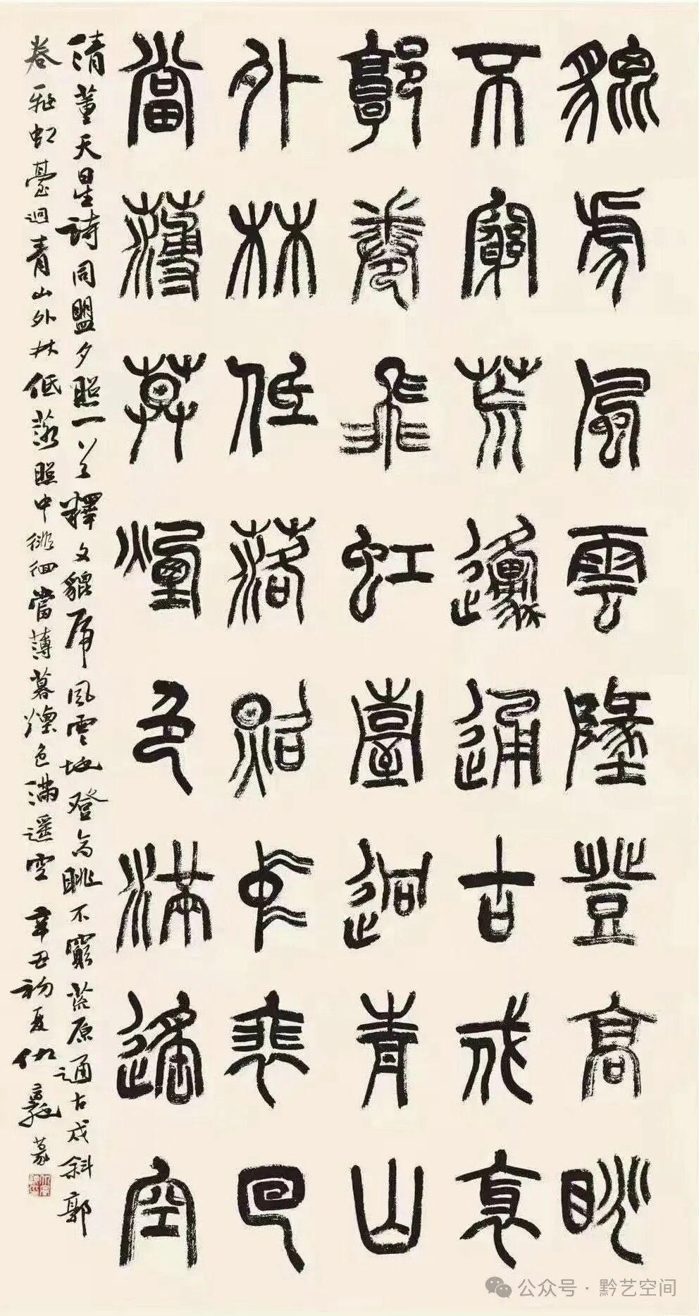 他尤为注重书法文化属性的当代转化。在“仇氏小篆”的构建中,既保留篆书作为正体的庄严感,又通过墨色枯润变化、字形方圆处理等手法,赋予作品现代视觉张力。这种入古出新的审美追求,在其作品中体现得淋漓尽致,如他的篆书中堂《春夜喜雨》,通篇以秦篆为基,却在转折处参以行草笔意,使静态篆书产生时空流动之感,堪称传统笔墨语言现代转译的典范。