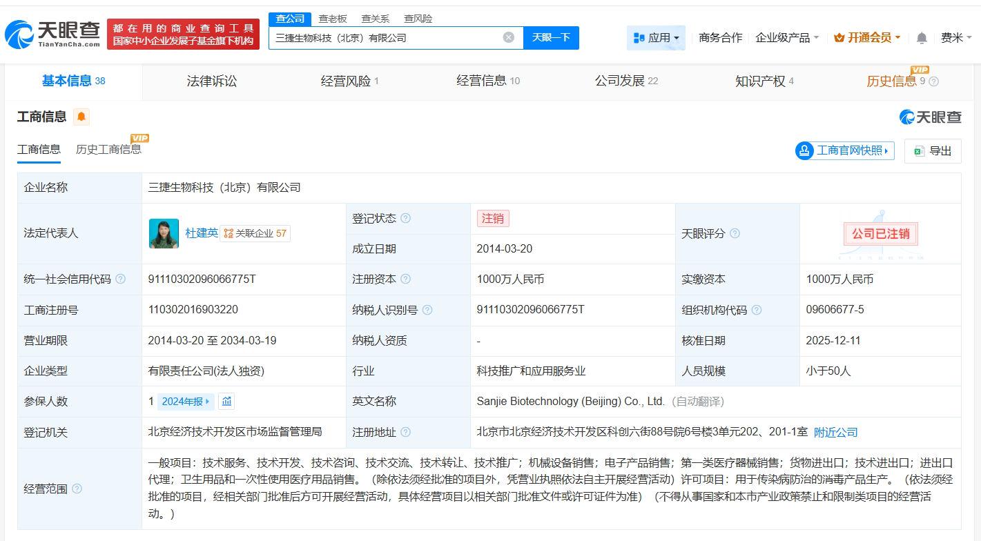 天眼查App显示,近日,三捷生物科技(北京)有限公司登记状态由存续变更为注销,此前,该公司已发布简易注销公告。