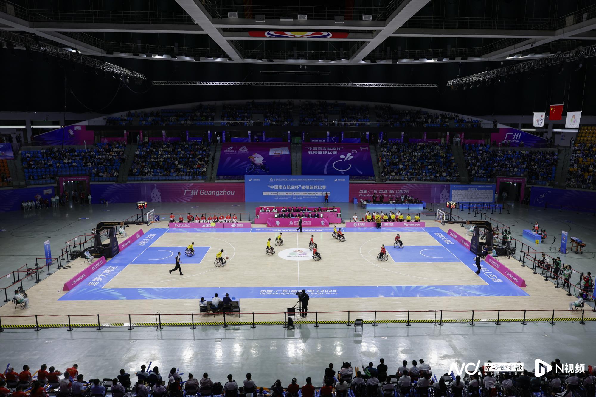 2025年12月15日,全国第十二届残运会暨第九届特奥会轮椅篮球(五人制)比赛,广东一团对阵北京队,广东球员在比赛中拼抢。