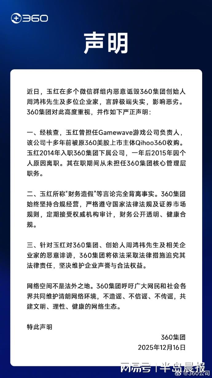 12月16日,360集团发布关于玉红恶意诋毁360集团创始人周鸿祎先生的严正声明: