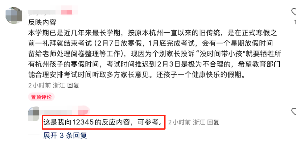 昨天刚公布杭州市中小学期末考试时间安排后,就遭到部分家长的吐槽和投诉,有家长认为寒假缩短都是因为“没时间带小孩”的家长投诉导致的,于是也纷纷向12345投诉。