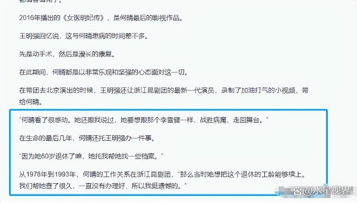 好友王明强透露,何晴临终前有两个遗憾,这比病痛本身更让她煎熬,第一个遗憾,是没续上自己在浙江昆剧团的工龄。