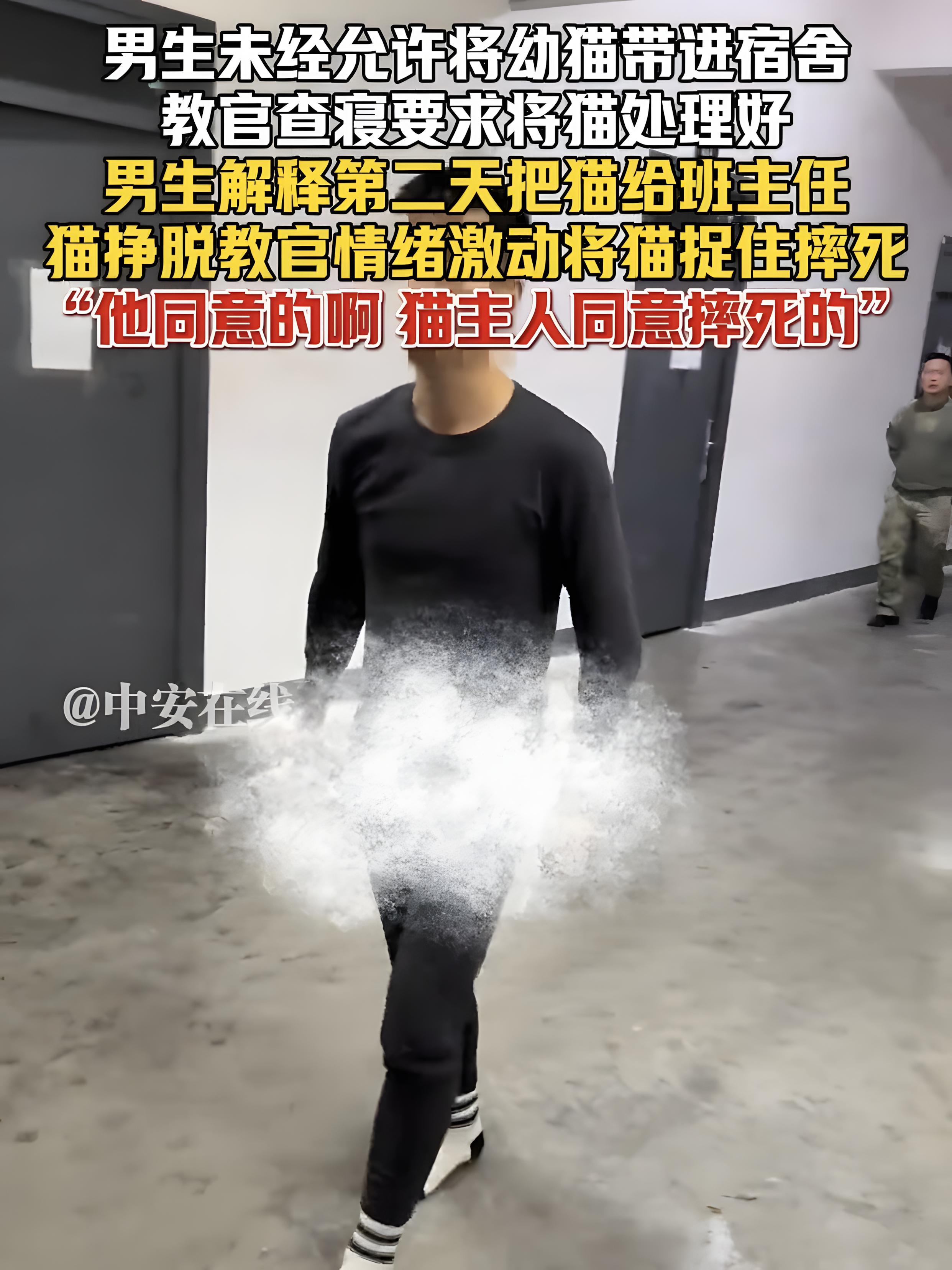 事件的起点,本是学生违反校规将小猫带进宿舍。查寝时教官发现这只蜷缩在角落的小猫,按学校规定本应妥善处理,可猫主人的态度,从一开始就充满了对抗性:他举着手机怼到教官面前录像,身后围站着起哄的同学,整个人透着 “你能奈我何” 的嚣张。教官拎着小猫,语气还算平静地反复确认:“确定要我摔?你真同意?” 他的目光甚至扫向一旁的班主任,像是在寻求见证,试图让学生冷静下来。教官拎着小猫,语气还算平静地反复确认:“确定要我摔?你真同意?” 他的目光甚至扫向一旁的班主任,像是在寻求见证,试图让学生冷静下来。