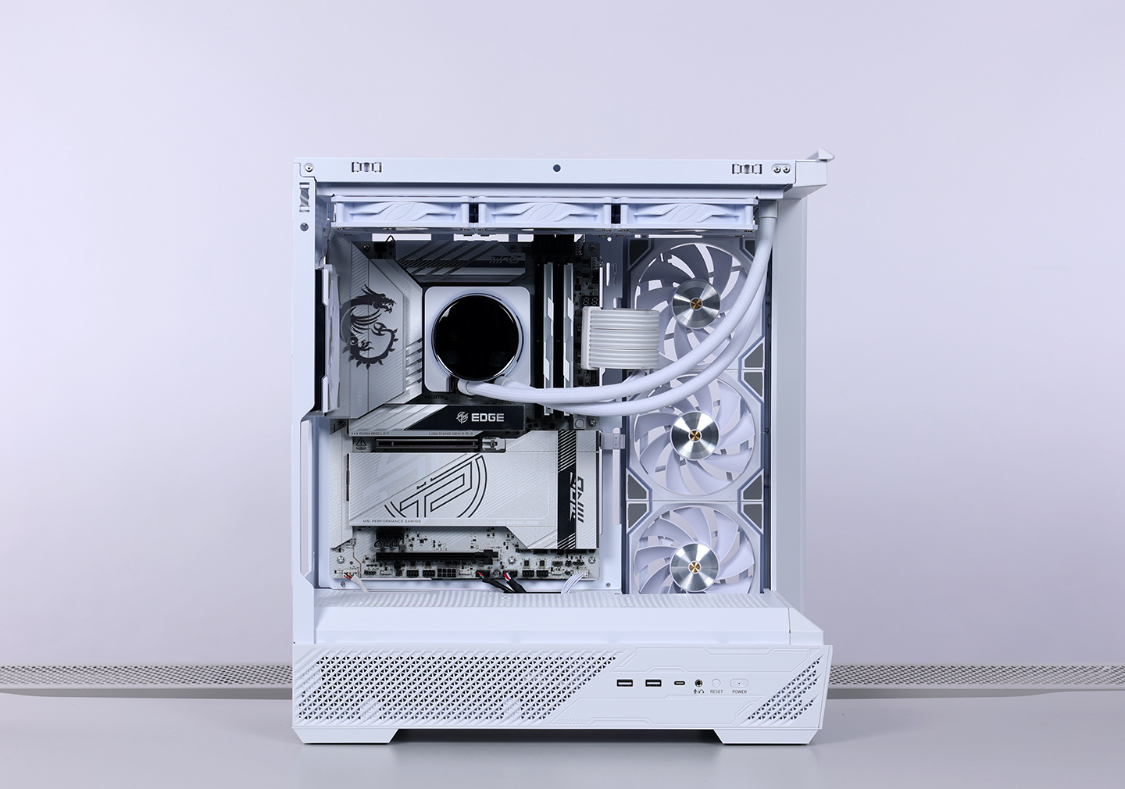 全白配色,左侧上段钢化玻璃面板,下段电源仓外侧采用斜纹网状开孔,散热有保障。