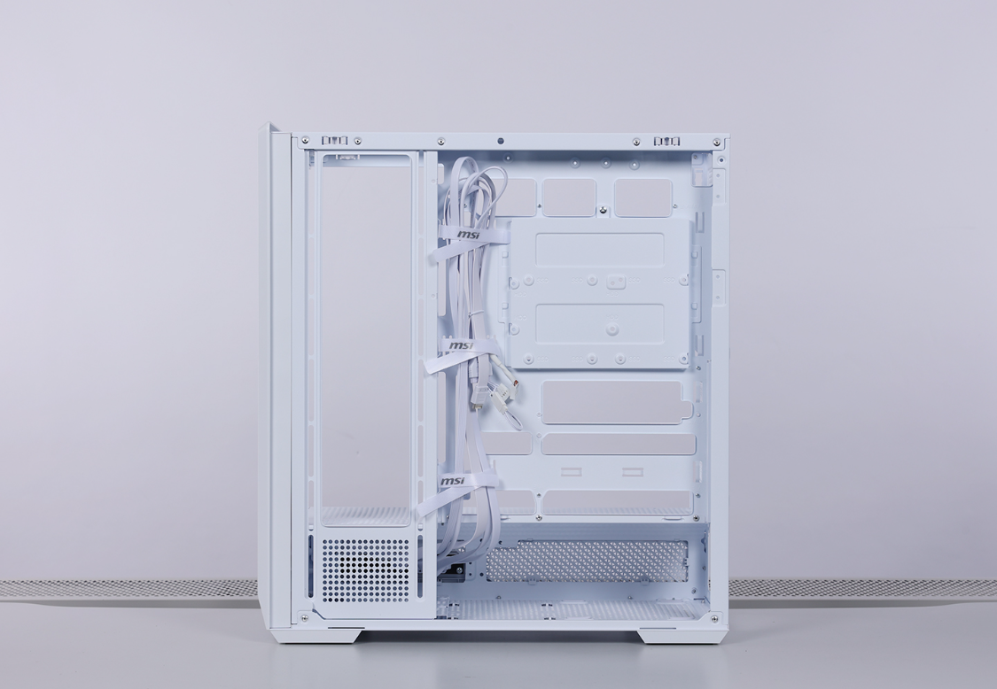 机箱前脸玻璃面板底部有微星龙盾LOGO,辨识度直接拉满。靠下部分斜切开孔设计搭配机箱内部同样部分斜切的设计,可以提高机箱散热效能。