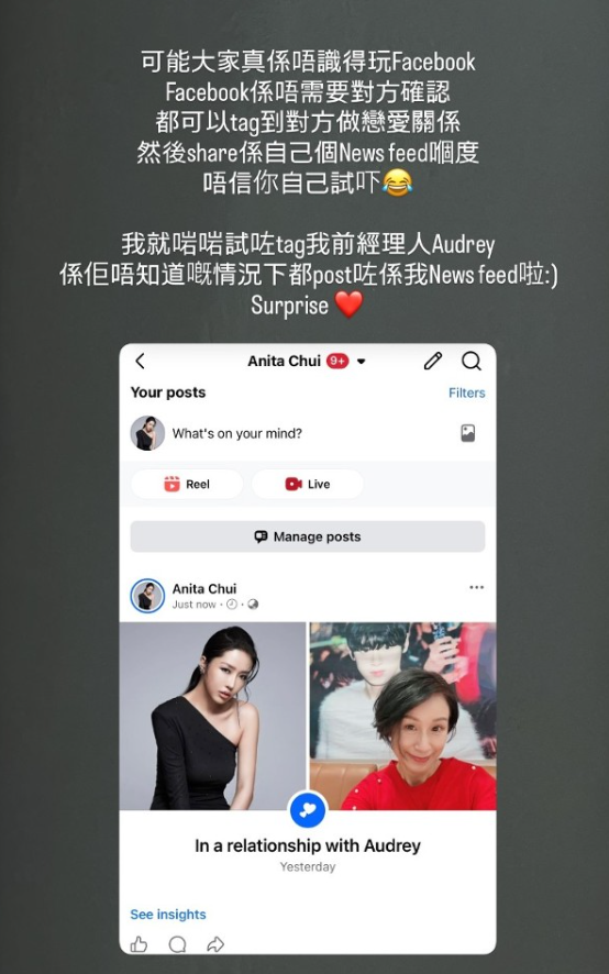 而今日她再次发文表示,社交平台的感情状态设置并不需要双方确认:“是不需要对方确认,也能标记对方为恋爱关系,然后分享到自己的动态里,不信的话你们自己试试看。我刚刚就试着标记了我的前经纪人 Audrey,在她完全不知情的情况下,也已经发布到我的动态里了!惊喜吧。”