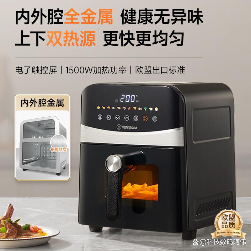 这款推荐给预算稍微充足,且对健康材质有极高要求的朋友。市面上几百块的炸锅内胆多是塑料加涂层,高温下总让人有点心理负担。西屋这款直接用了全金属内腔,耐用性和安全性拉满,而且完全没有塑料异味。它的容量是6L,同样支持免翻面功能。最让我觉得贴心的是它的控温非常精准,做那种对温度敏感的低温慢烤牛排也能胜任。虽然价格比前两款稍贵,但如果你是那种买一个家电打算用好几年的人,它的做工质感绝对物超所值。