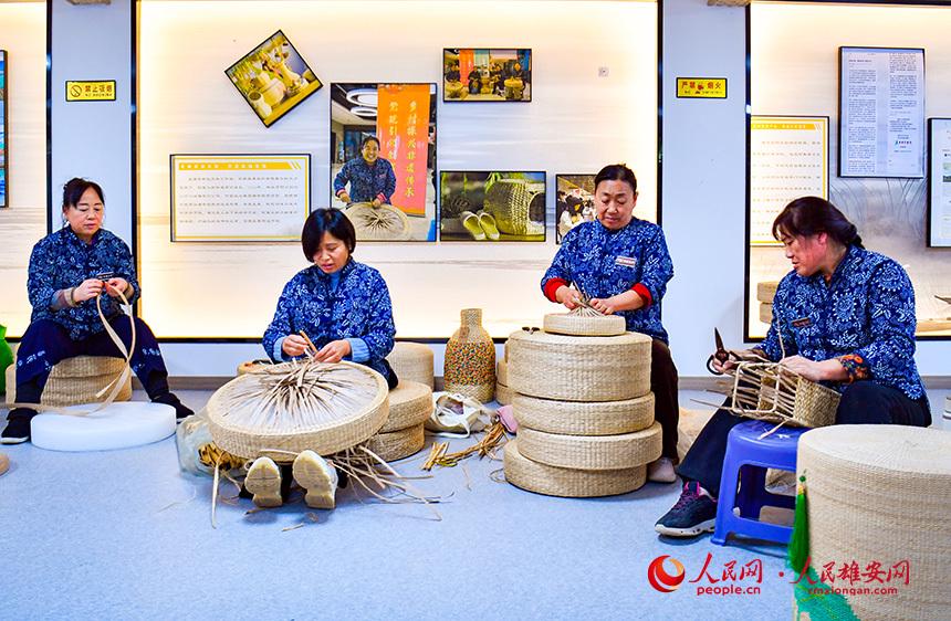 “创富工坊”内,村民们正在用蒲草编织蒲团等各类手工艺品。人民网记者 宋烨文摄
