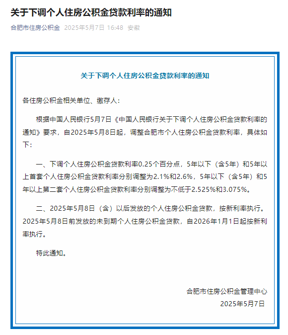 公积金利率下调是2025年合肥房地产市场最受关注的政策之一。根据合肥市住房公积金管理中心2025年5月7日发布的《关于下调个人住房公积金贷款利率的通知》,调整幅度、执行规则及省息效果均需重点解析。