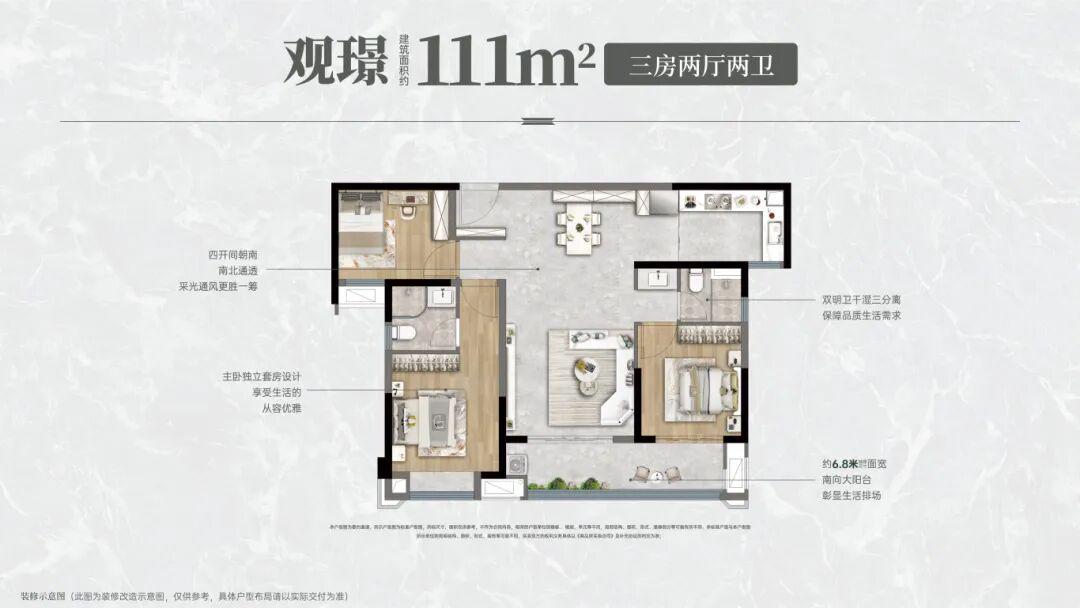 建面约111㎡三房两厅两卫,户型方正通透,三开间朝南且全明设计,约6.8 米大面宽阳台兼具观景与实用功能,三大卧室南向布局,让每一位家人都能享受充足采光。✅✅✅售楼处☎️预约热线:400-159-8559转分机号5555【已认证】