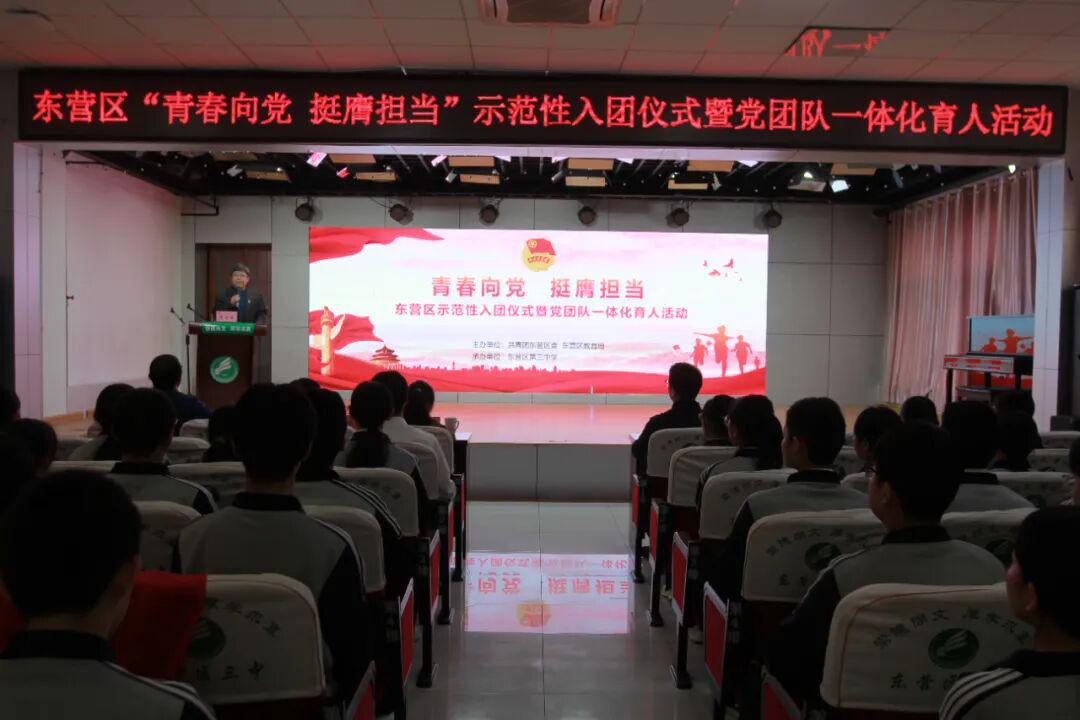 为深入贯彻习近平总书记关于青年工作的重要思想,加强青少年思想政治引领,规范团员发展工作,筑牢党、团、队一体化育人链条,12月16日,东营区“青春向党 挺膺担当”示范性集中入团仪式暨党团队一体化育人活动在区三中举办。团区委、区教育局团工委、区三中有关负责同志,新发展团员、少先队员和家长代表共300余人参加。