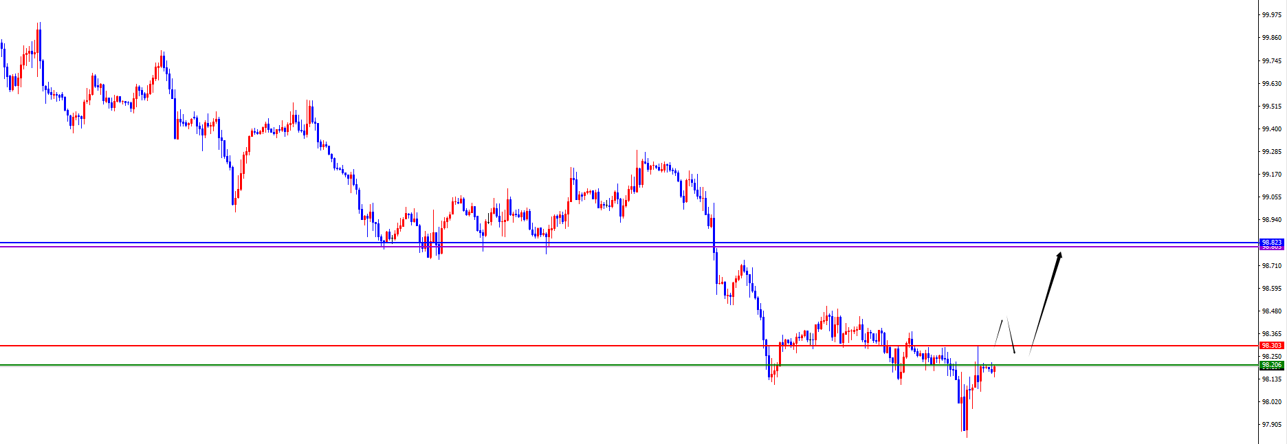 短线关键分水岭98.20-30区域,价格没有出现反转信号之前维持空(重点关注价格能否站稳上涨是关键)