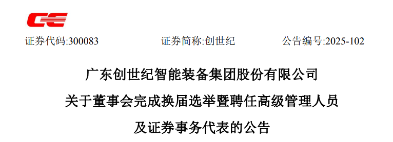 公告显示,广东创世纪智能装备集团股份有限公司当日召开2025年第六次临时股东会,审议通过董事会换届选举相关议案,选举出3名非独立董事、2名独立董事,共同组成公司第七届董事会。其中非独立董事3名,为夏军、肖文、凌文锋;独立董事2名,为周台、叶卫平;董事长、法定代表人为夏军。第七届董事会任期自2025年第六次临时股东会审议通过之日起三年。