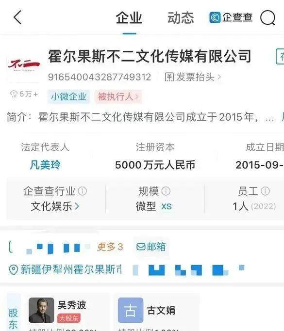 2024年6月,吴秀波的霍尔果斯不二文化传媒有限公司,因违反财产报告制度,被列入失信被执行人名单。