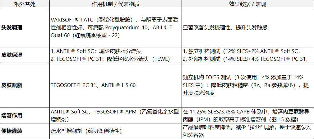 优质增稠剂除调节粘度外,还能为产品带来多种额外功能,提升产品附加值,包括头发调理,皮肤保湿、皮肤赋脂、增溶作用等,具体如下表所示: