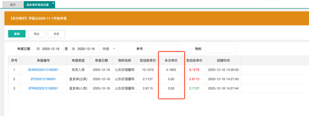 库存管理-成本单价变动记录表,新增【本次单价】项