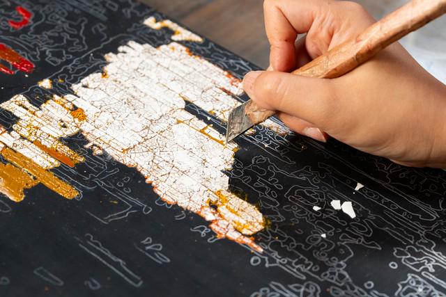 跟着郑师傅走进工坊,空气里混着大漆的清香与桐油的温润,墙上挂满了各式漆器,有薄如蝉翼的花瓶,也有造型典雅的屏风,雕、镂、刻、填的装饰工艺让每一件作品都透着匠心。郑师傅忽然停在一件作品前,指着细腻的漆色:"这是 ' 赤宝砂 ' 工艺,在漆面上撒上金银粉,再髹涂多层透明漆,形成璀璨夺目的效果。" 她拿起一根特制的漆刷,熟练地在胎体上涂抹,"选料要讲究,胎体用夏布和生漆裱糊,大漆要用秦岭的野生漆树汁液,这样做出的漆器坚固耐用、光泽持久。"